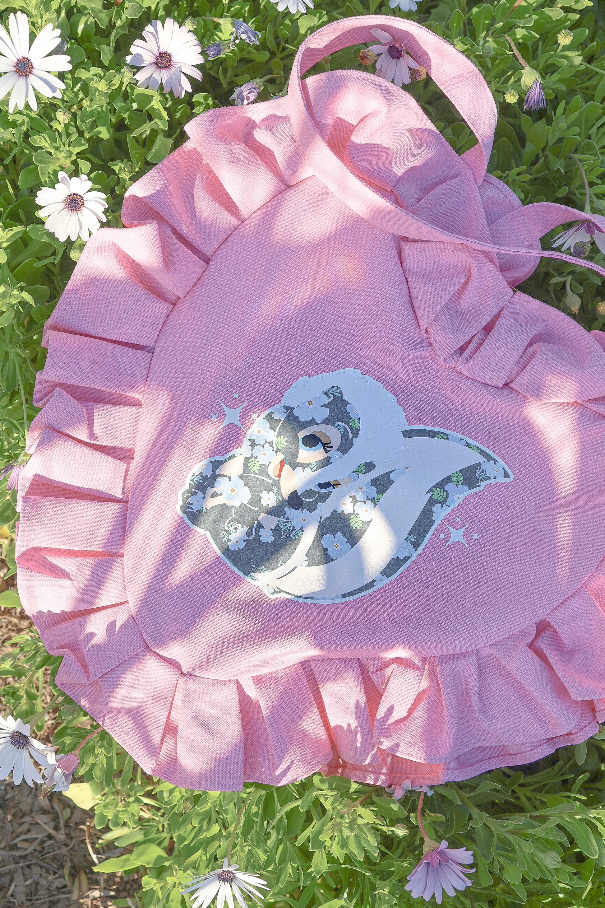 Jumbo canvas ruffle tote with design on both sides
